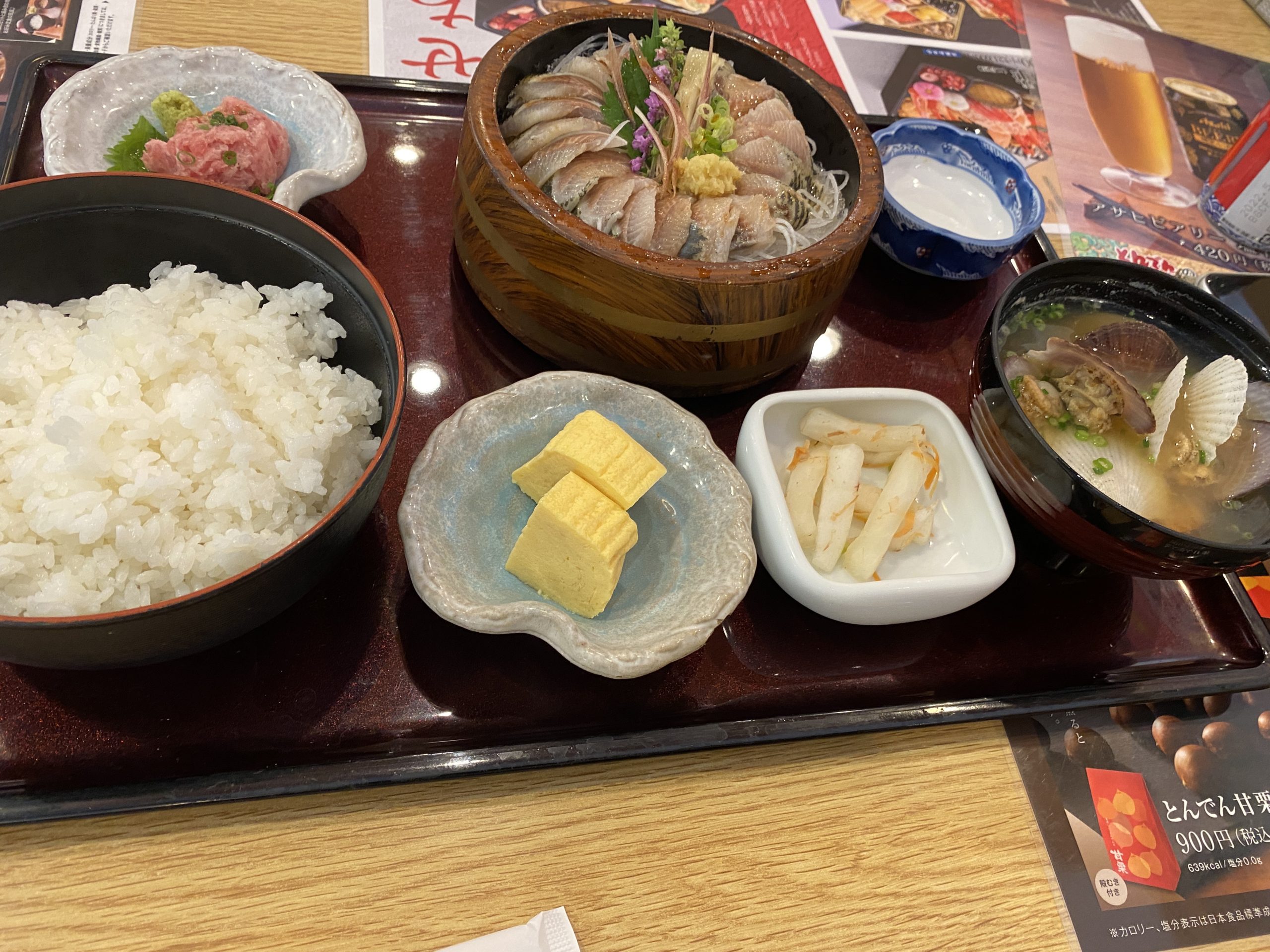 イワシのお刺身やネギトロを堪能し、お味噌汁はミニサイズのホタテが大量のお椀です。